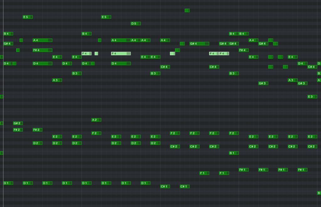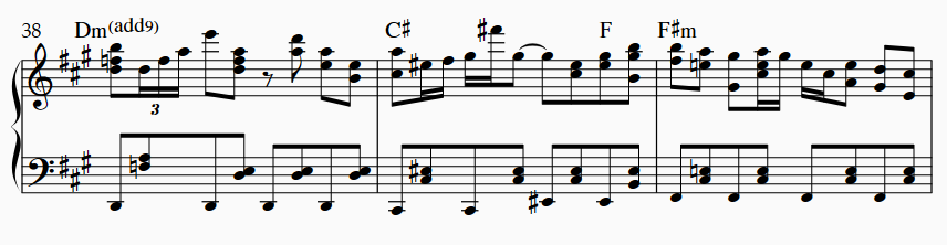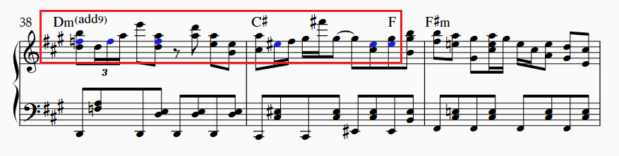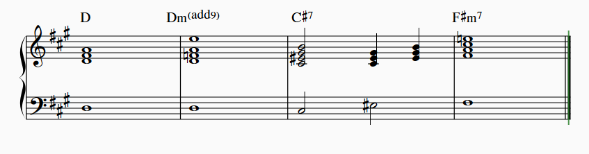 次の図は D → Dm → C# → F#m (IV → IVm → III → VIm) というよくある進行にテンションがちょっと付いたものである。