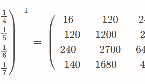 ヒルベルト行列 – Wikipedia 2×2 のヒルベルト行列の逆行列 $$ \beg […]