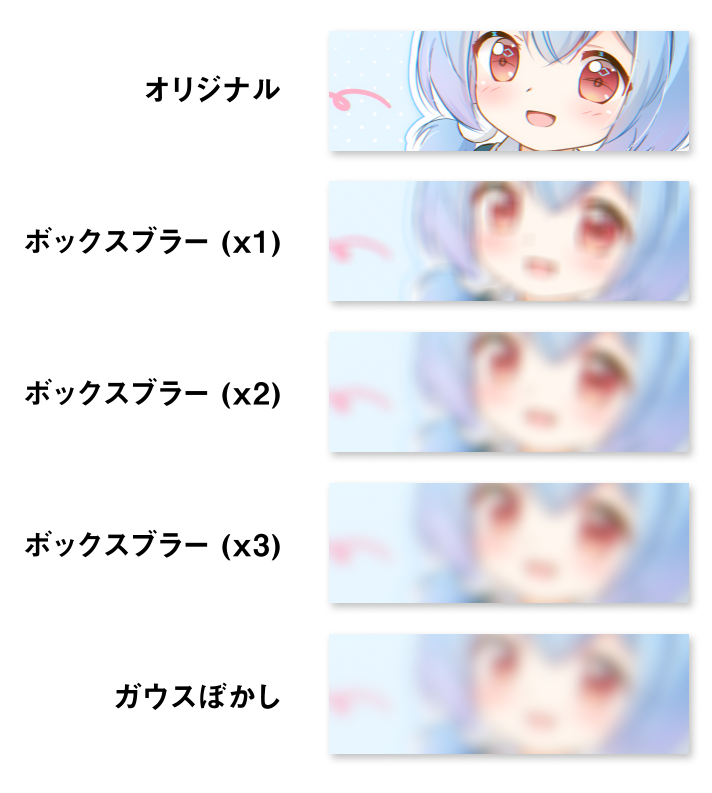 以下の画像を見ると、1 回のボックスブラーではエッジが目立っているが、繰り返し何度もボックスブラーを掛けることで、ガウスぼかしとある程度似たような結果を得ることができている。