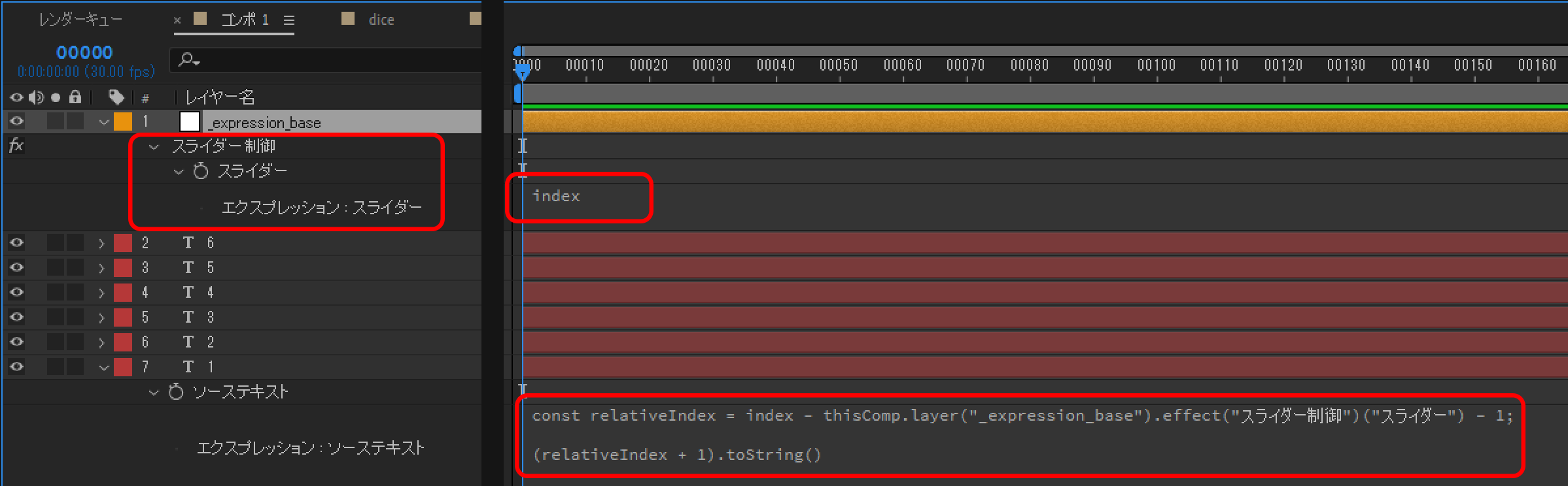 このエクスプレッションでは index の値が変わったとしても、それと同じ量だけスライダー制御の値も変わります。これにより、後から調整レイヤーを追加したり、背景のホワイト平面を追加したりしても、エクスプレッションの結果が変わらないようにできます。relativeIndex が 0 オリジン (0-indexed) になるように、1 を引いていますが、好みによって変えても構いません。