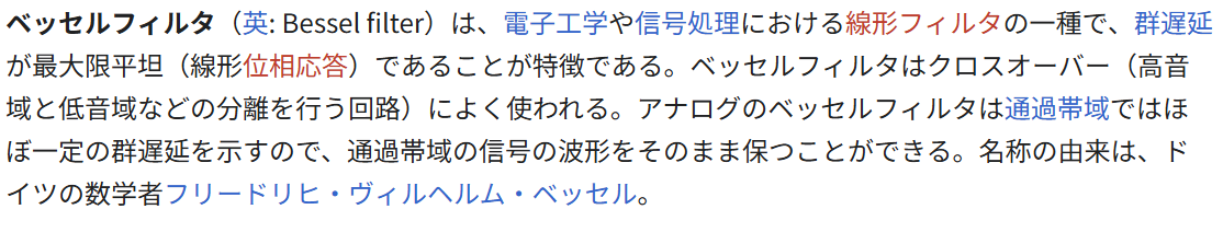 Wikipedia のベッセルフィルタの項目には次のように記載されている。
