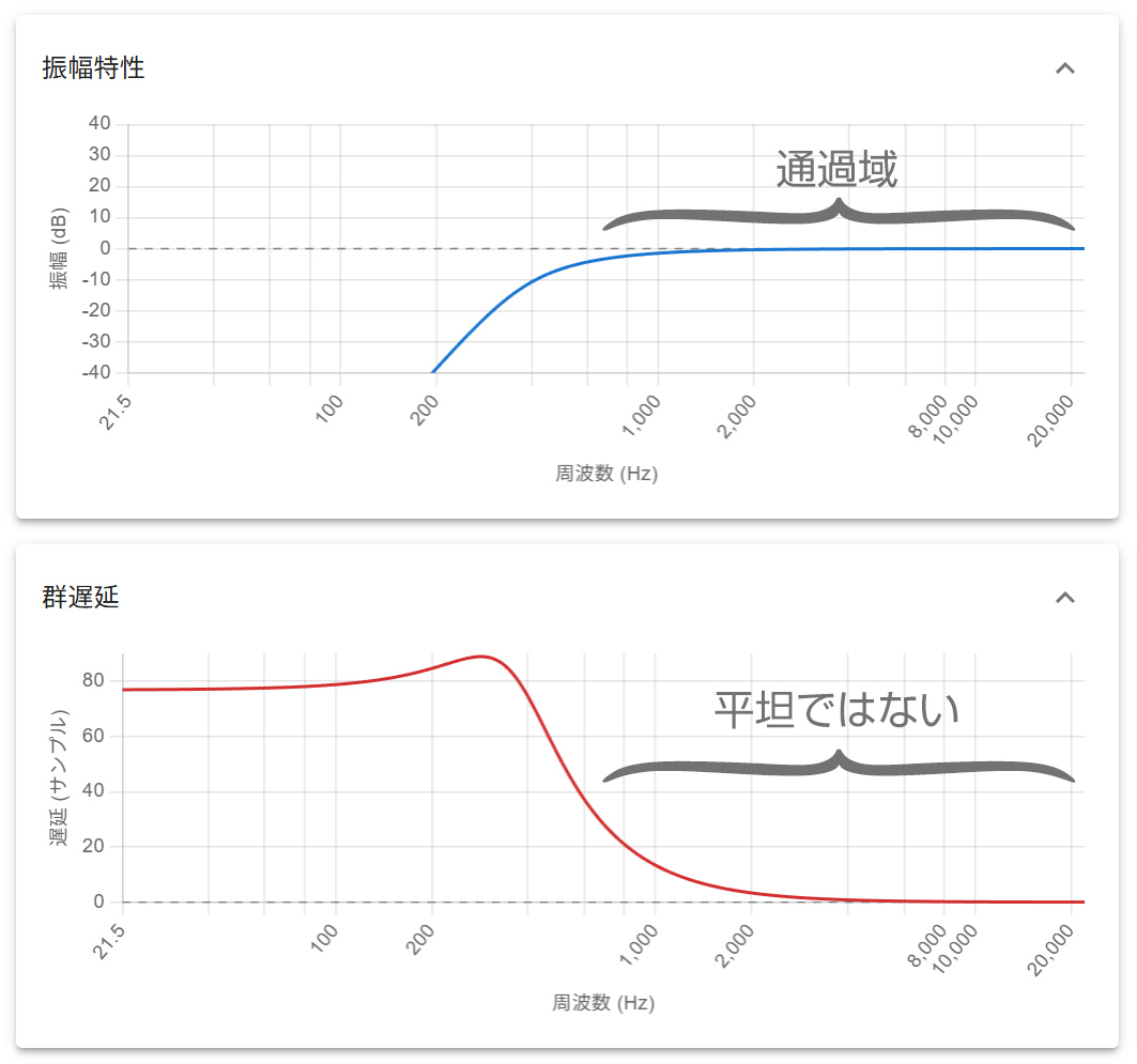 仮に高域側で群遅延が最大限平坦な HPF を構成できたとする。しかし、この場合、マルチバンドコンプレッサーの高域バンドと低域バンドが干渉しないように、通過域での遅延サンプル数を一致させる必要がある。このためには、LPF の $\omega=0$ の周辺での群遅延と、 HPF の $\omega=\pi$ の周辺での群遅延が一致するように、定数時間の遅延を追加しなければならない。